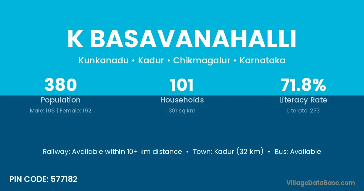 Kadur (32 km) is the nearest town to K Basavanahalli village for major economic activities and is located approximately 32 km away.
