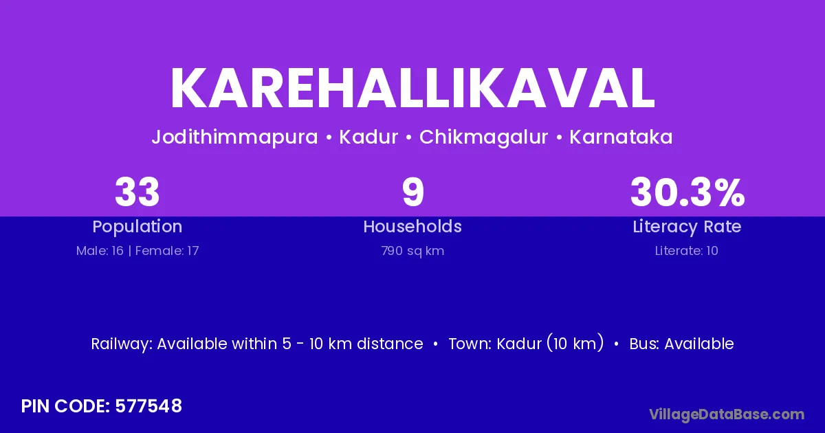 Karehallikaval village has a total population of 33 people, of which 16 are males and 17 are females.
