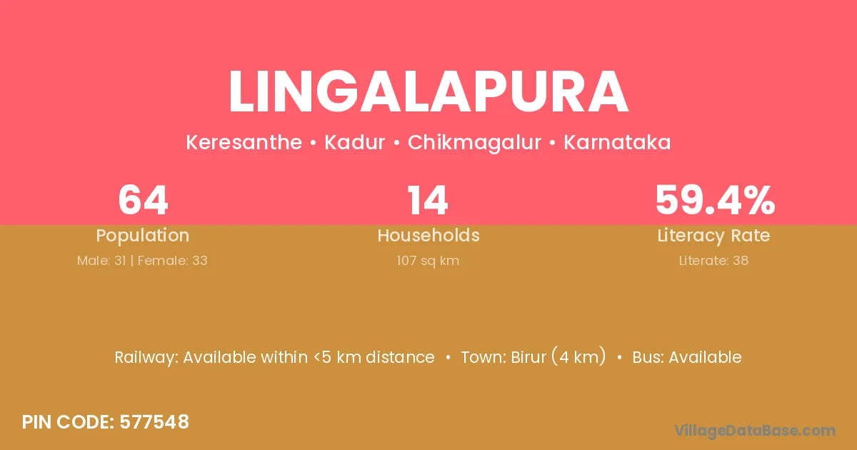 Birur (4 km) is the nearest town to Lingalapura village for major economic activities and is located approximately 4 km away.