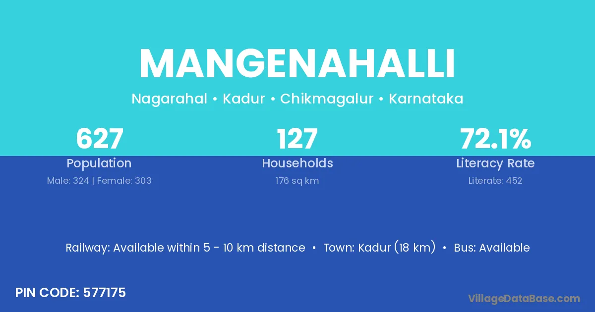 Kadur (18 km) is the nearest town to Mangenahalli village for major economic activities and is located approximately 18 km away.