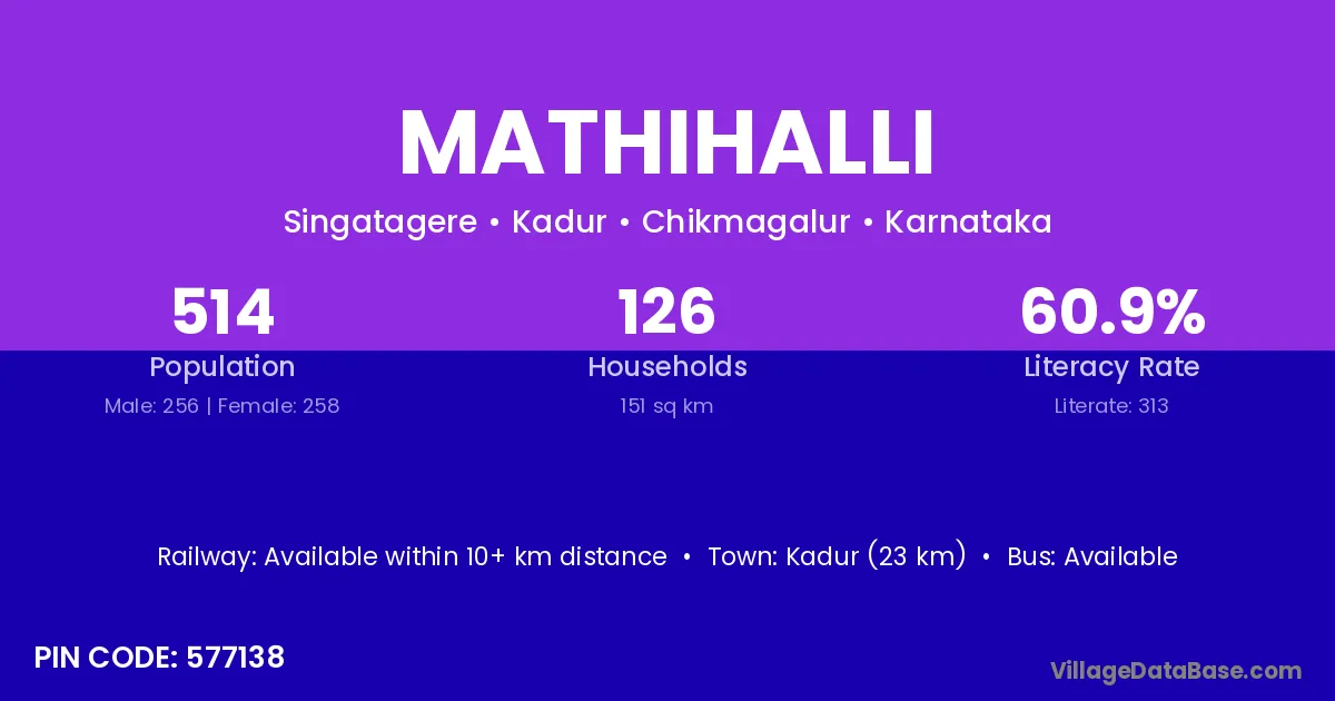 Kadur (23 km) is the nearest town to Mathihalli village for major economic activities and is located approximately 23 km away.