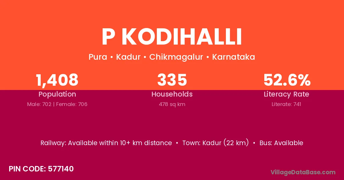 P Kodihalli village has a total population of 1,408 people, of which 702 are males and 706 are females.