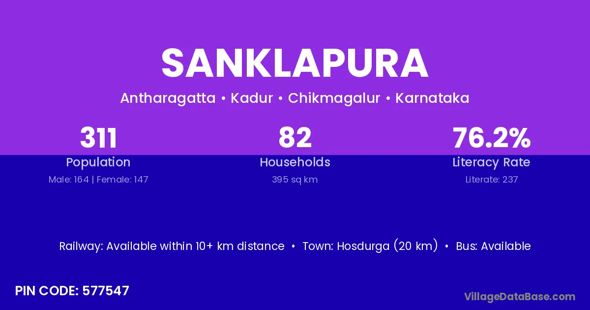 Hosdurga (20 km) is the nearest town to Sanklapura village for major economic activities and is located approximately 20 km away.