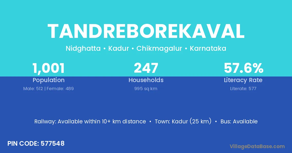 Kadur (25 km) is the nearest town to Tandreborekaval village for major economic activities and is located approximately 25 km away.
