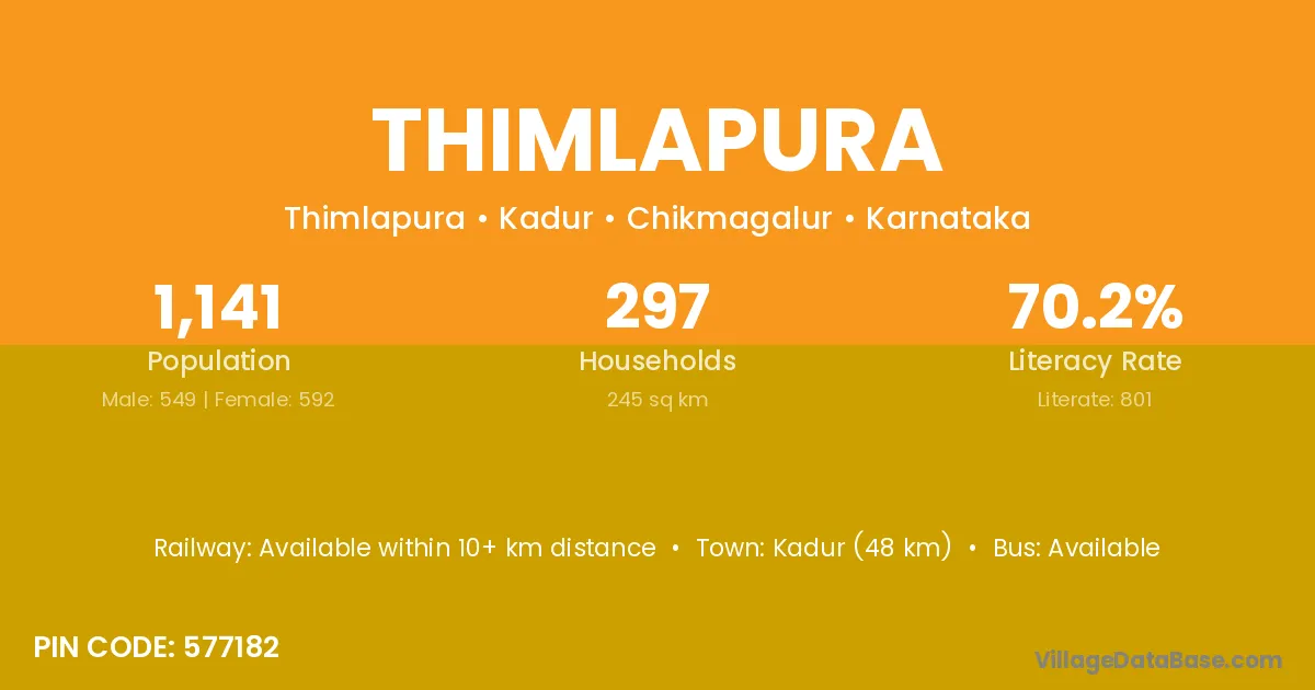 Kadur (48 km) is the nearest town to Thimlapura village for major economic activities and is located approximately 48 km away.