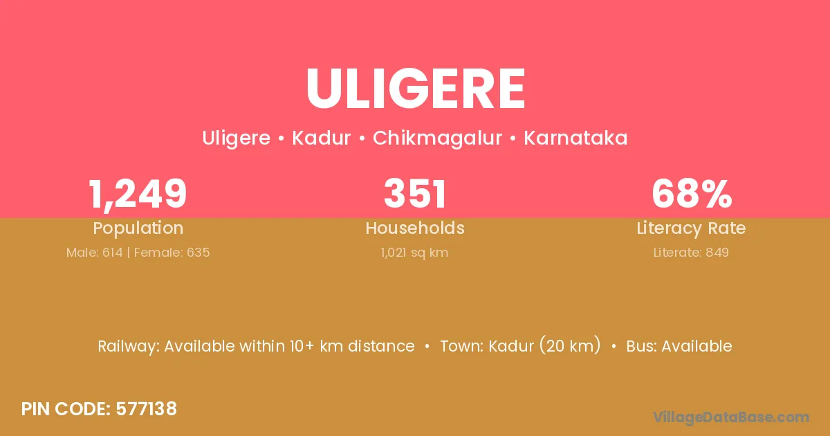 Kadur (20 km) is the nearest town to Uligere village for major economic activities and is located approximately 20 km away.