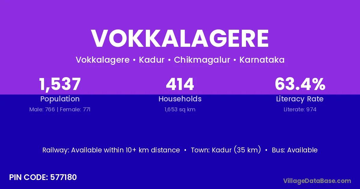 Kadur (35 km) is the nearest town to Vokkalagere village for major economic activities and is located approximately 35 km away.