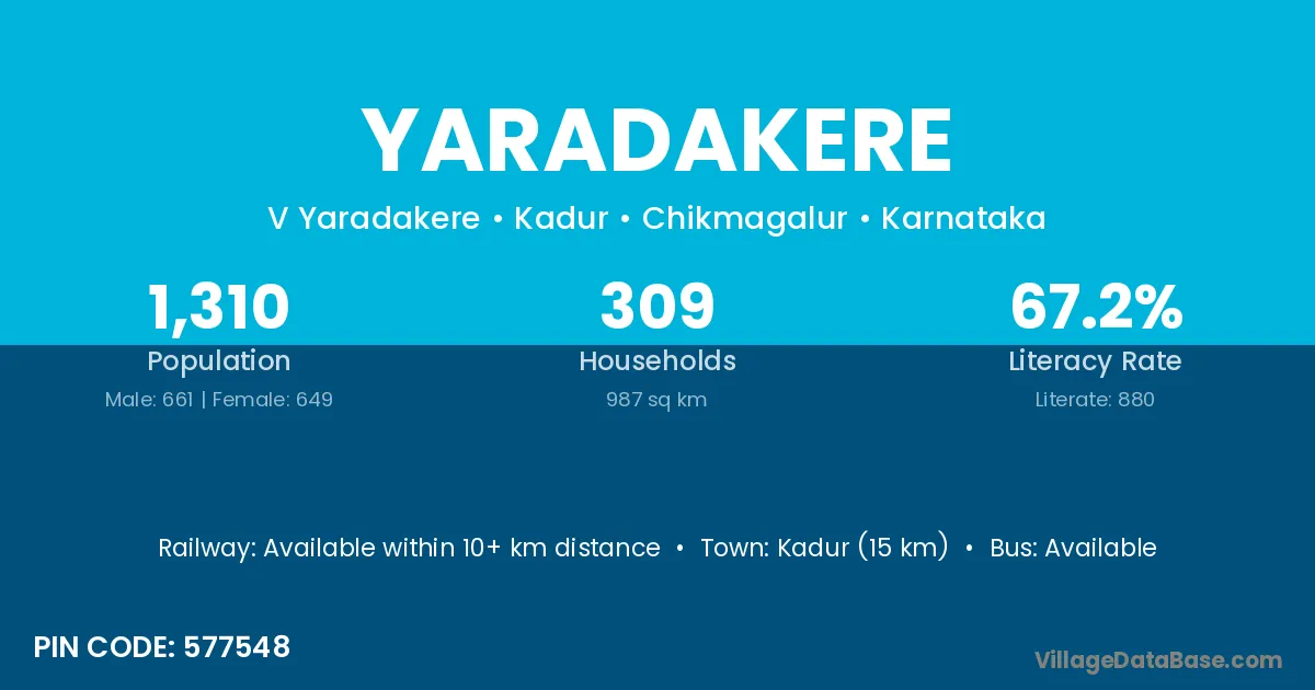 Kadur (15 km) is the nearest town to Yaradakere village for major economic activities and is located approximately 15 km away.