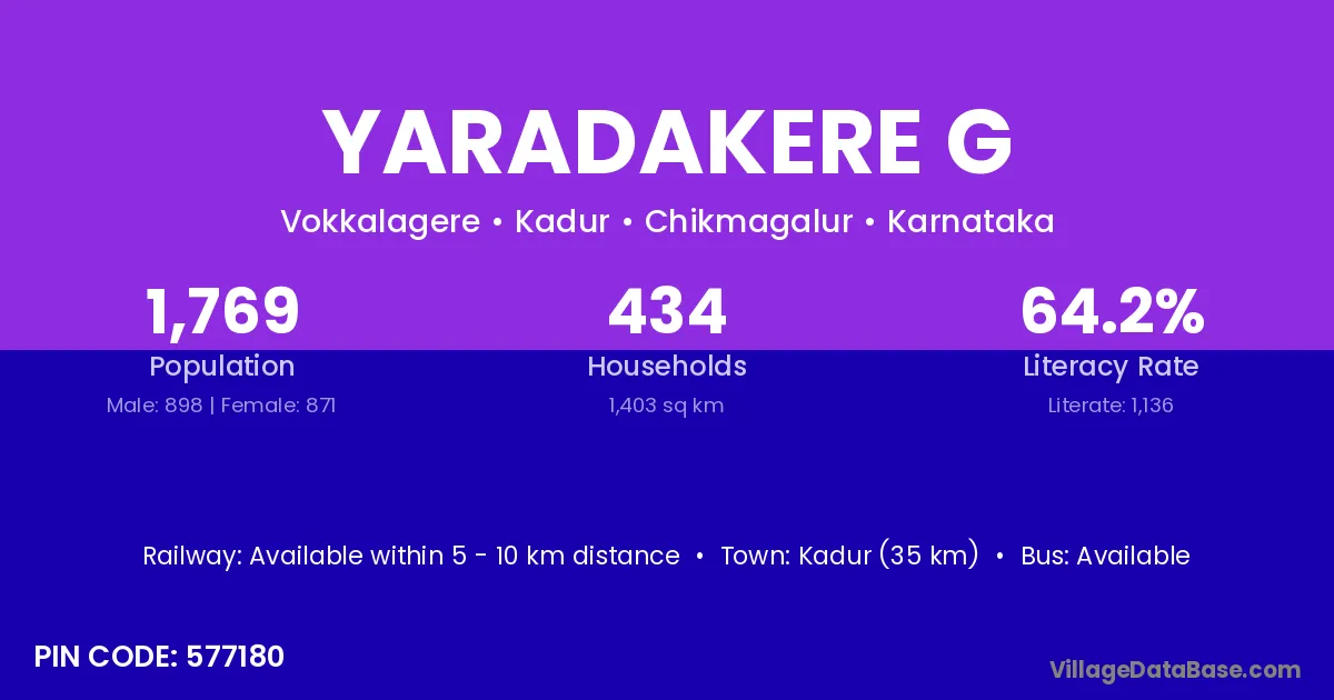 Kadur (35 km) is the nearest town to Yaradakere G village for major economic activities and is located approximately 35 km away.