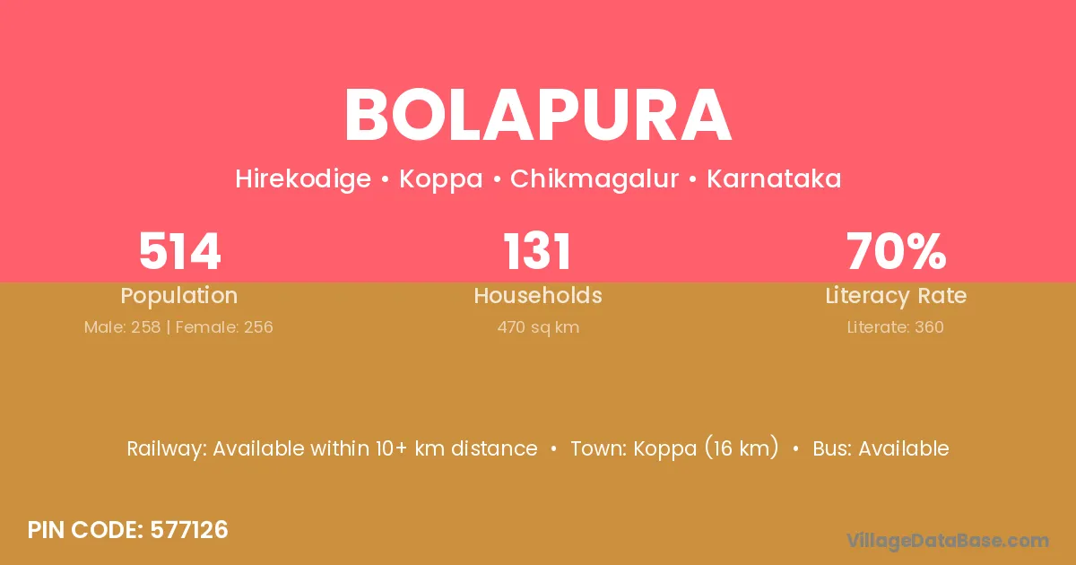 Bolapura village has a total population of 514 people, of which 258 are males and 256 are females.