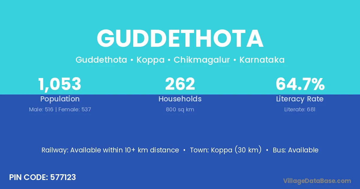 Koppa (30 km) is the nearest town to Guddethota village for major economic activities and is located approximately 30 km away.