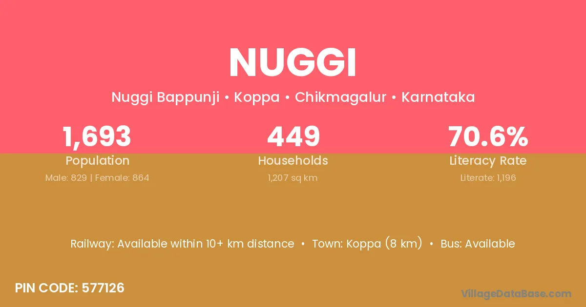 Koppa (8 km) is the nearest town to Nuggi village for major economic activities and is located approximately 8 km away.