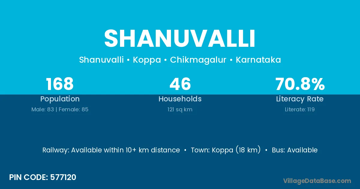 Koppa (18 km) is the nearest town to Shanuvalli village for major economic activities and is located approximately 18 km away.