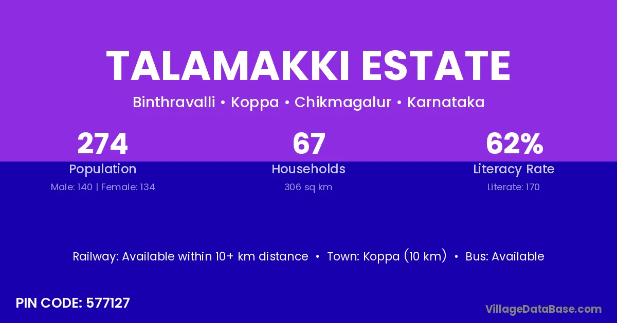 Talamakki Estate village has a total population of 274 people, of which 140 are males and 134 are females.