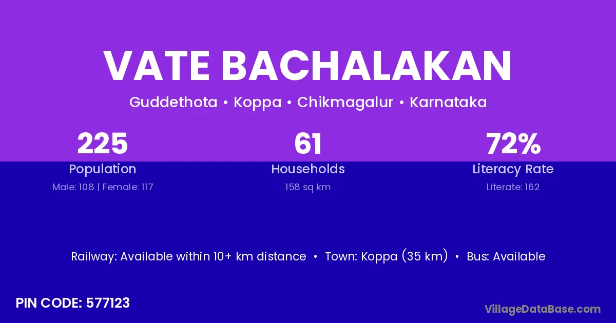 Koppa (35 km) is the nearest town to Vate Bachalakan village for major economic activities and is located approximately 35 km away.