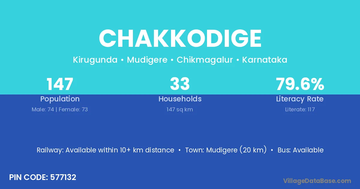 Chakkodige village has a total population of 147 people, of which 74 are males and 73 are females.