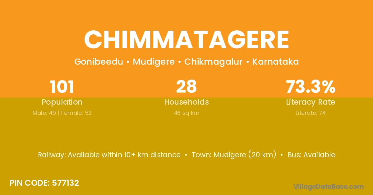 Chimmatagere village has a total population of 101 people, of which 49 are males and 52 are females.