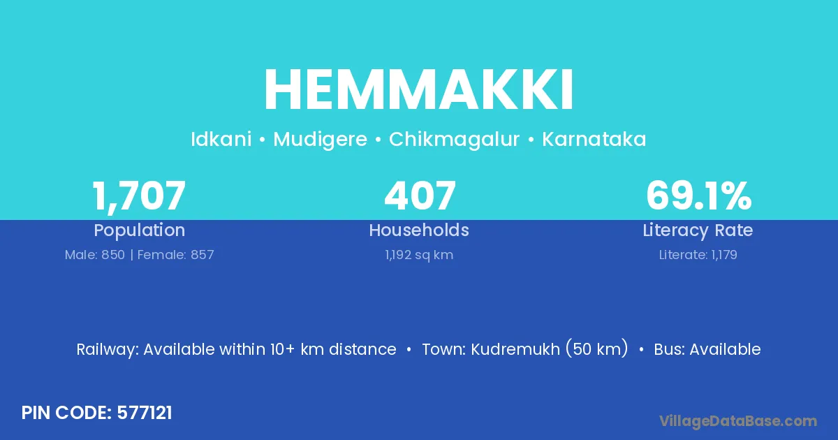 Kudremukh (50 km) is the nearest town to Hemmakki village for major economic activities and is located approximately 50 km away.