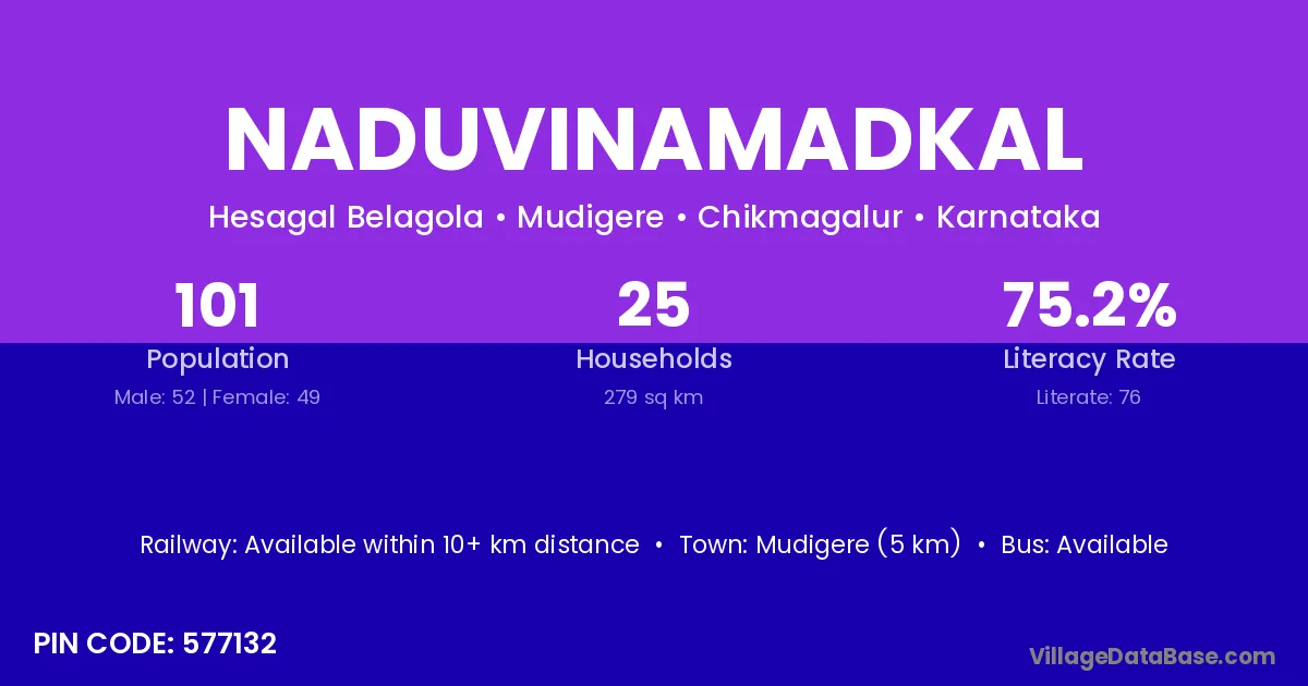 Mudigere (5 km) is the nearest town to Naduvinamadkal village for major economic activities and is located approximately 5 km away.