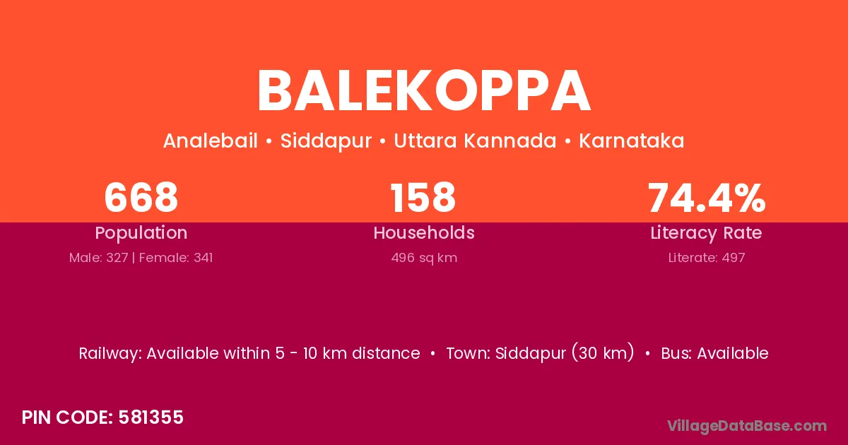 The literacy rate of Balekoppa village is 74.86%. Male literacy stands at 78.95% and female literacy at 70.86%.