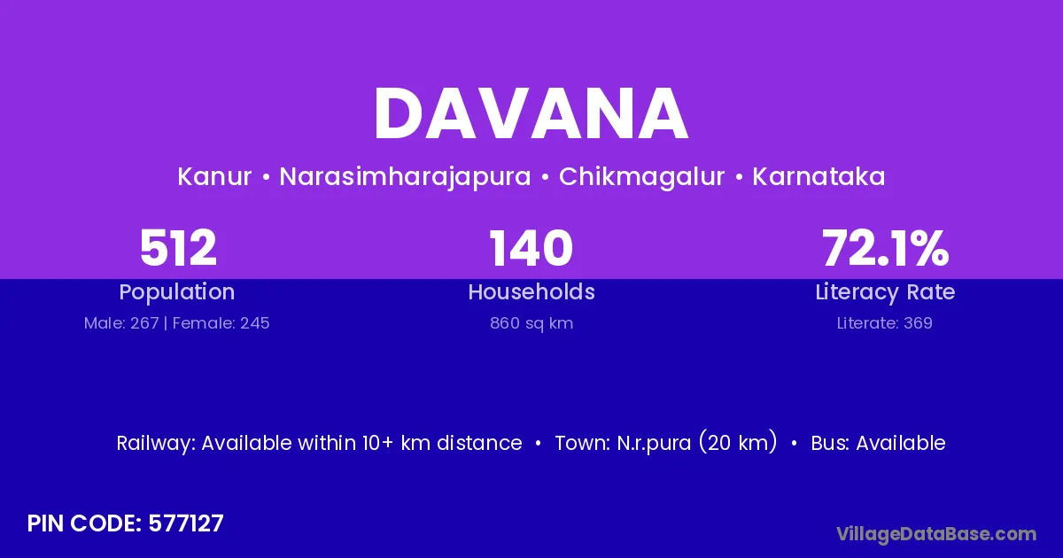 N.r.pura (20 km) is the nearest town to Davana village for major economic activities and is located approximately 20 km away.