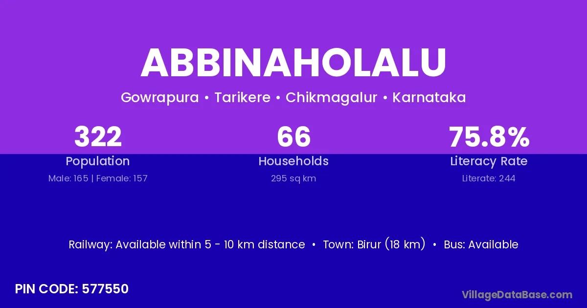 Birur (18 km) is the nearest town to Abbinaholalu village for major economic activities and is located approximately 18 km away.