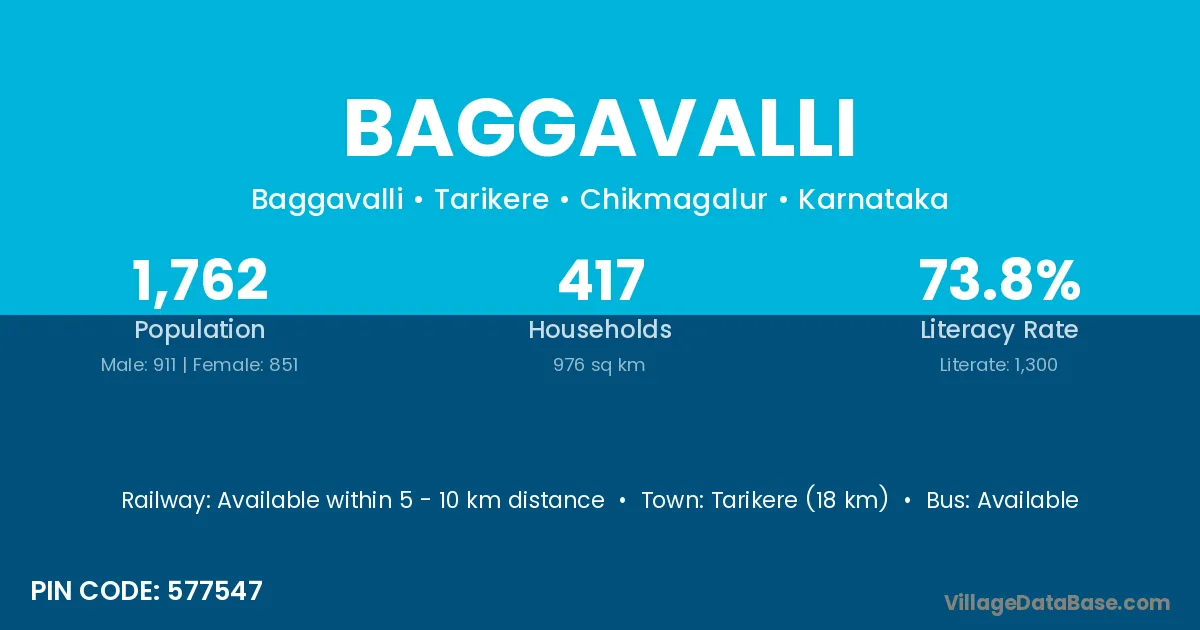 Tarikere (18 km) is the nearest town to Baggavalli village for major economic activities and is located approximately 18 km away.