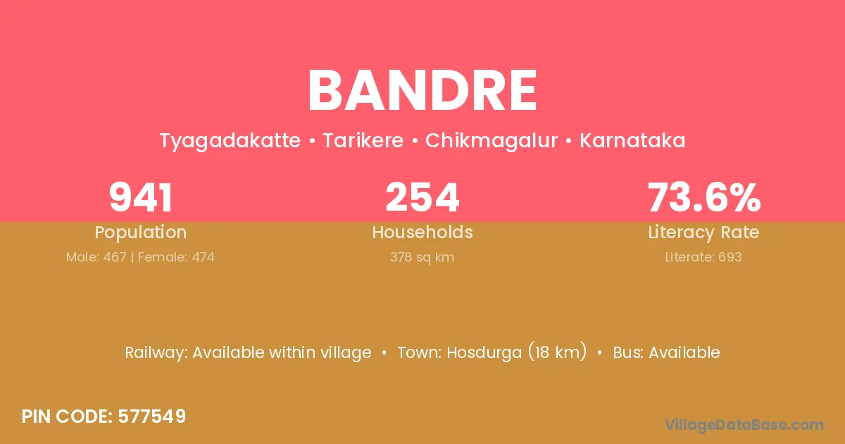 Hosdurga (18 km) is the nearest town to Bandre village for major economic activities and is located approximately 18 km away.