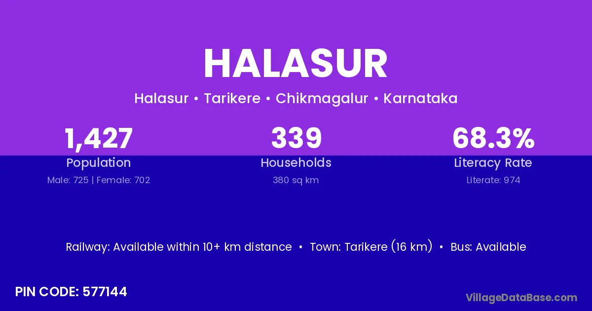 Tarikere (16 km) is the nearest town to Halasur village for major economic activities and is located approximately 16 km away.