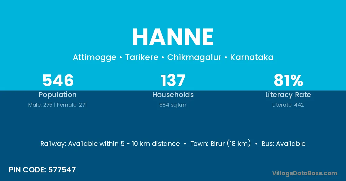 Birur (18 km) is the nearest town to Hanne village for major economic activities and is located approximately 18 km away.