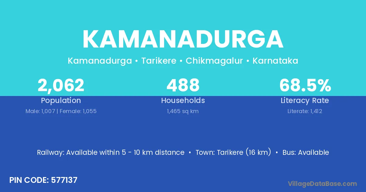 Tarikere (16 km) is the nearest town to Kamanadurga village for major economic activities and is located approximately 16 km away.