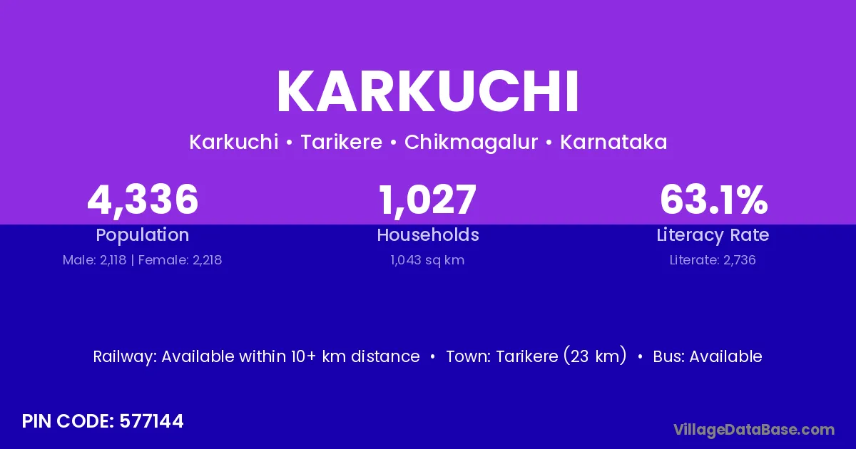 Tarikere (23 km) is the nearest town to Karkuchi village for major economic activities and is located approximately 23 km away.