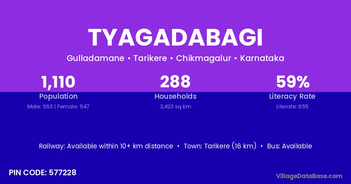 Tarikere (16 km) is the nearest town to Tyagadabagi village for major economic activities and is located approximately 16 km away.
