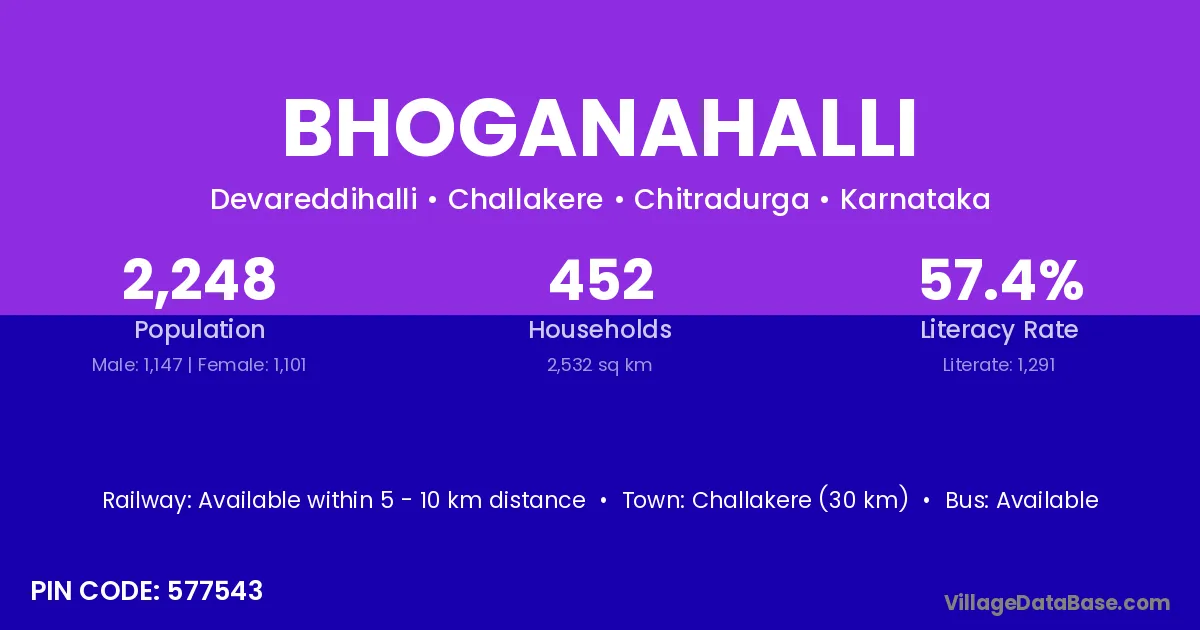 Bhoganahalli village has a total population of 2,248 people, of which 1,147 are males and 1,101 are females.