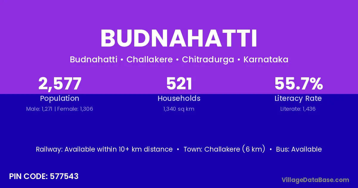 Challakere (6 km) is the nearest town to Budnahatti village for major economic activities and is located approximately 6 km away.