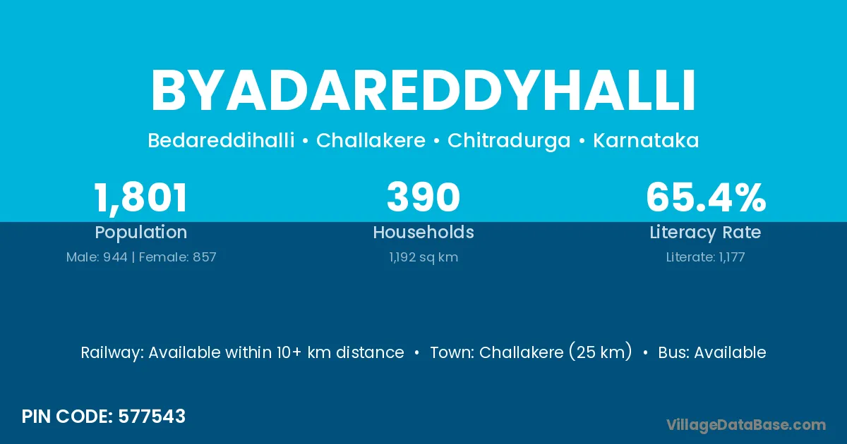 Challakere (25 km) is the nearest town to Byadareddyhalli village for major economic activities and is located approximately 25 km away.