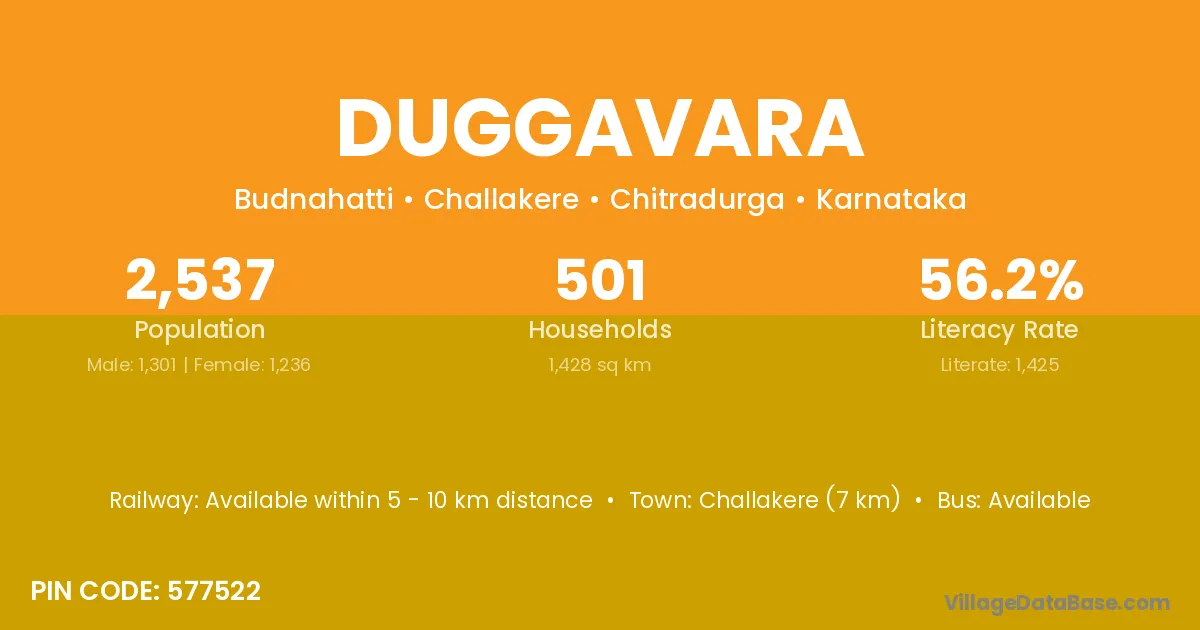 Challakere (7 km) is the nearest town to Duggavara village for major economic activities and is located approximately 7 km away.