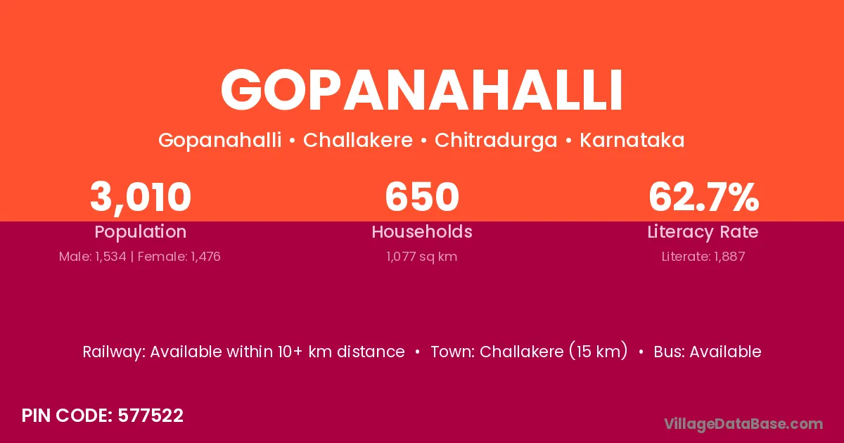 Challakere (15 km) is the nearest town to Gopanahalli village for major economic activities and is located approximately 15 km away.