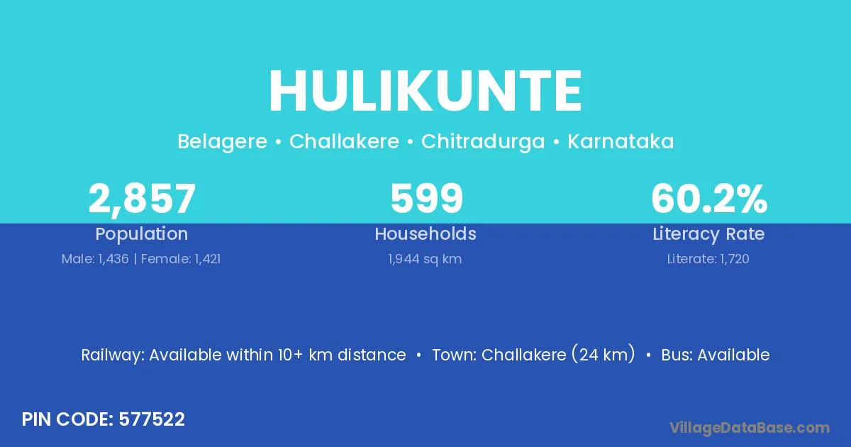 Challakere (24 km) is the nearest town to Hulikunte village for major economic activities and is located approximately 24 km away.