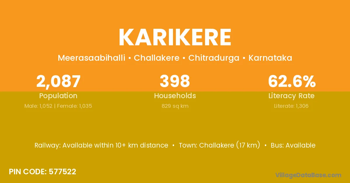 Challakere (17 km) is the nearest town to Karikere village for major economic activities and is located approximately 17 km away.