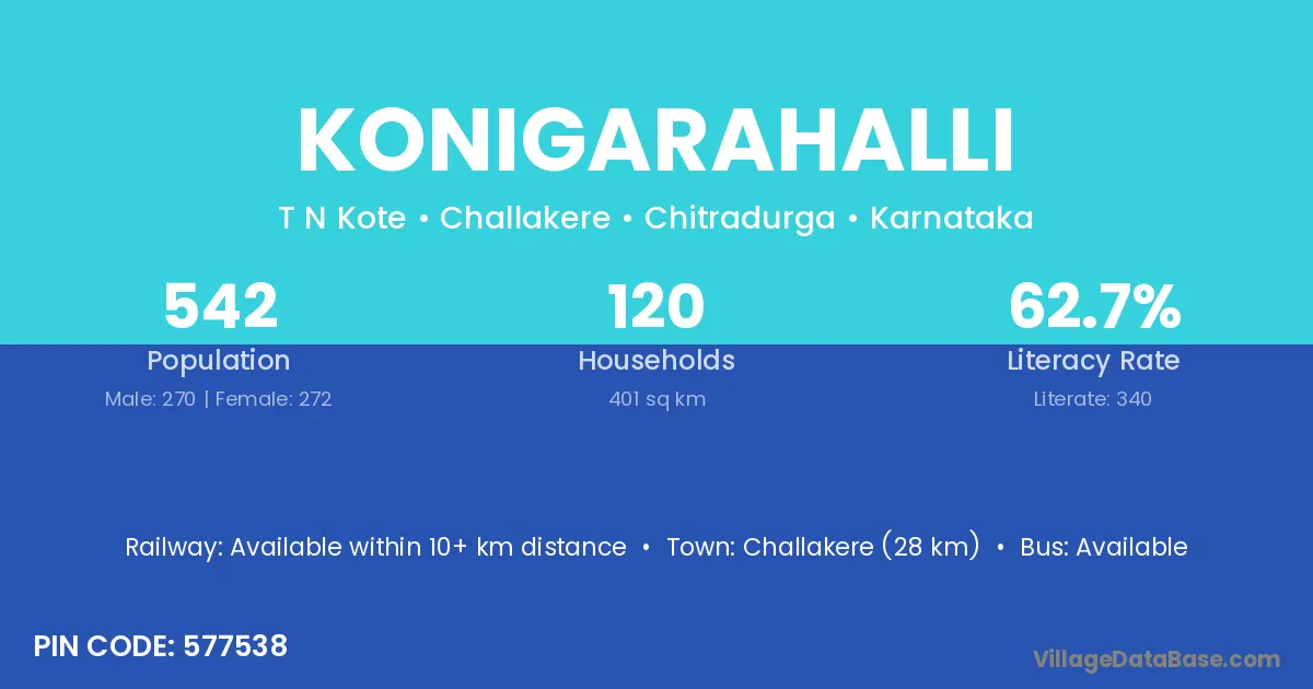 Konigarahalli village has a total population of 542 people, of which 270 are males and 272 are females.