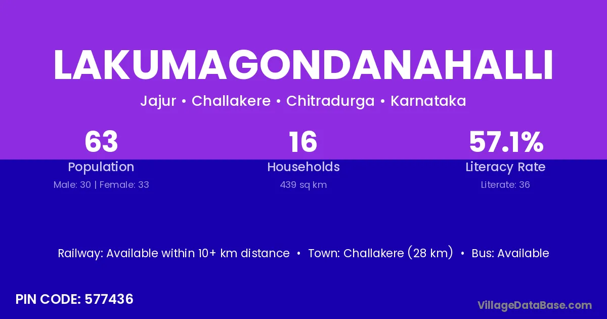 Lakumagondanahalli village has a total population of 63 people, of which 30 are males and 33 are females.