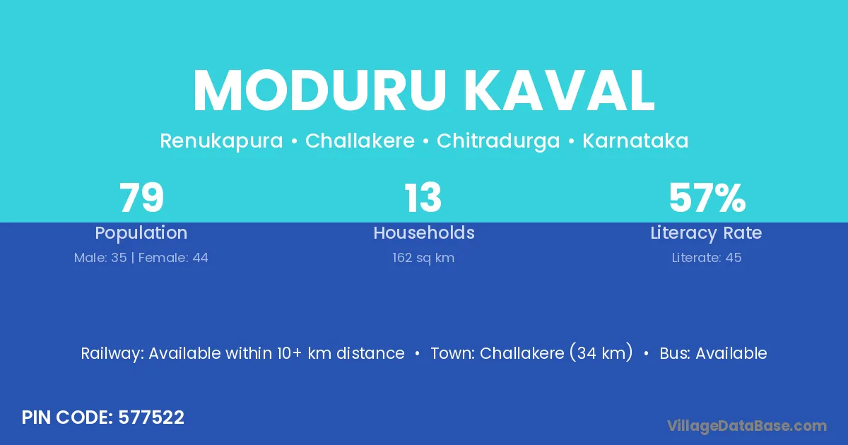 Challakere (34 km) is the nearest town to Moduru Kaval village for major economic activities and is located approximately 34 km away.