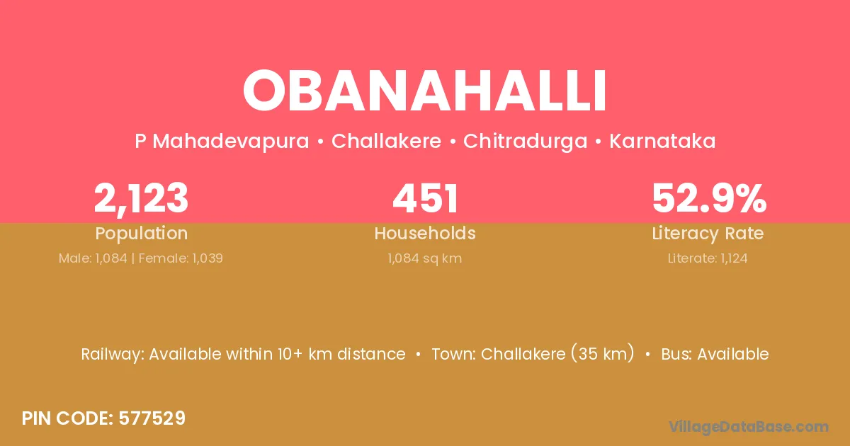 Obanahalli village has a total population of 2,123 people, of which 1,084 are males and 1,039 are females.