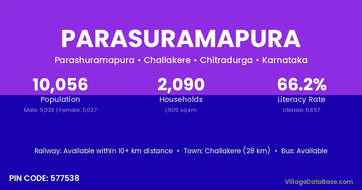 Challakere (28 km) is the nearest town to Parasuramapura village for major economic activities and is located approximately 28 km away.