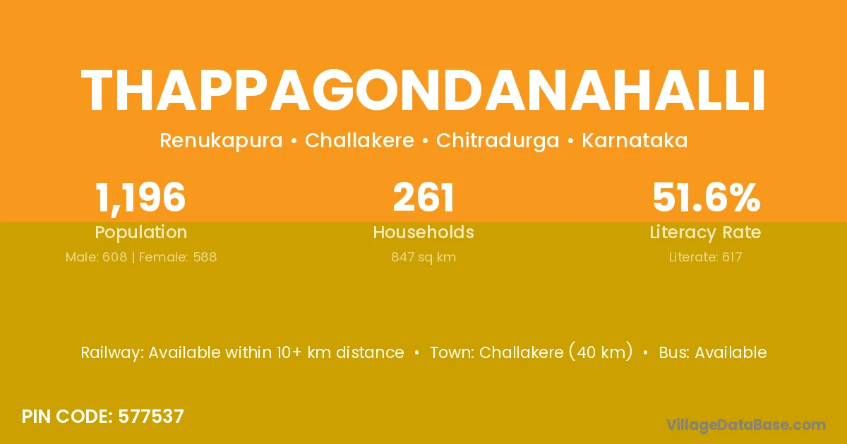 Challakere (40 km) is the nearest town to Thappagondanahalli village for major economic activities and is located approximately 40 km away.