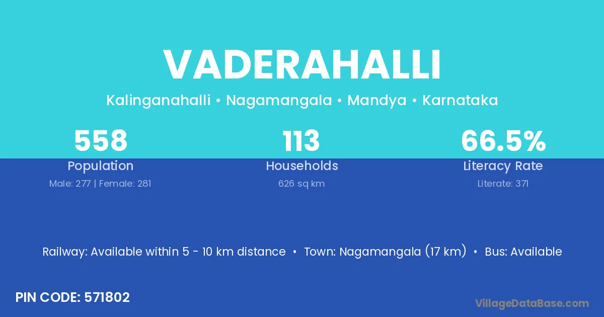 Vaderahalli village has a total population of 1,156 people, of which 597 are males and 559 are females.