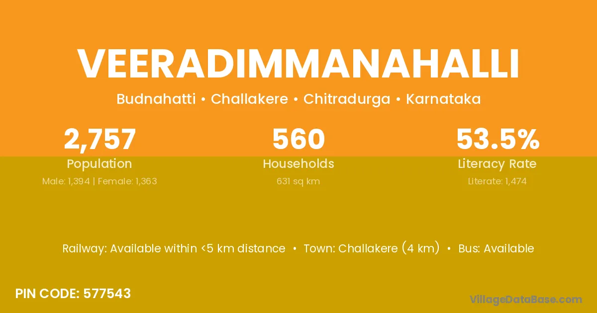Challakere (4 km) is the nearest town to Veeradimmanahalli village for major economic activities and is located approximately 4 km away.