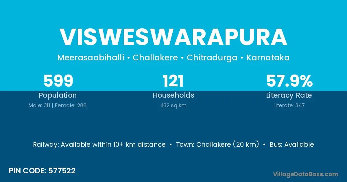 Challakere (20 km) is the nearest town to Visweswarapura village for major economic activities and is located approximately 20 km away.