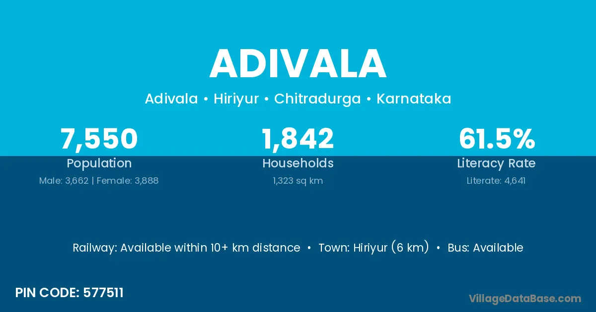 Hiriyur (6 km) is the nearest town to Adivala village for major economic activities and is located approximately 6 km away.